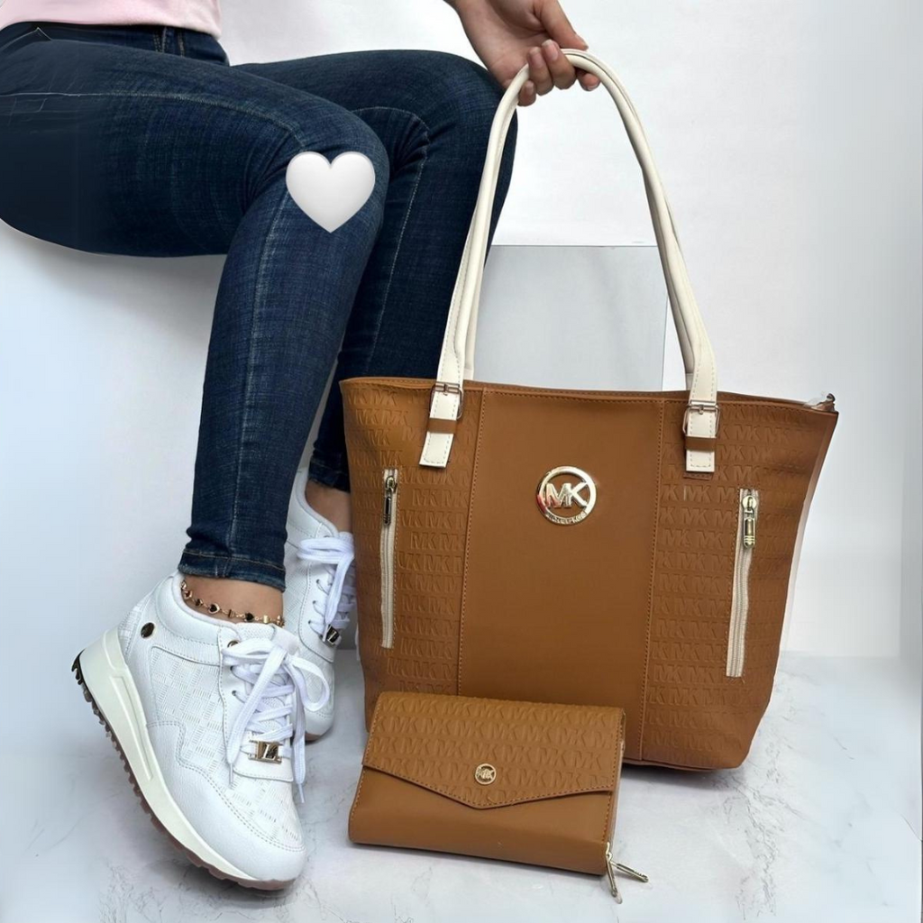 Una Combinación Ganadora: Sumérgete en la sofisticación con nuestro set exclusivo de bolso, billetera y tenis MK. Perfecto para la mujer moderna que no sacrifica comodidad por estilo.
